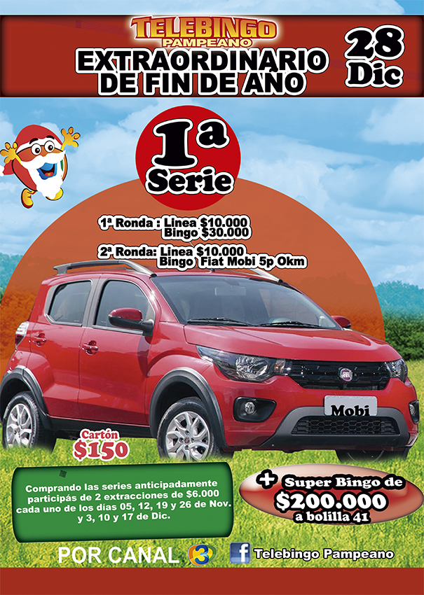 1ª Serie: 1ª Ronda : Linea $10.000 – Bingo $30.000 / 2ª Ronda: Linea $10.000 – Bingo Fiat Mobi 5p Okm
