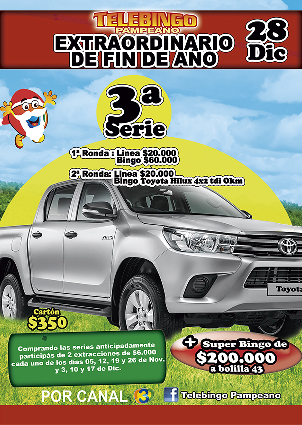 3ª Serie: 1ª Ronda : Linea $20.000 – Bingo $60.000 / 2ª Ronda: Linea $20.000 – Bingo Toyota Hilux 4×2 tdi Okm