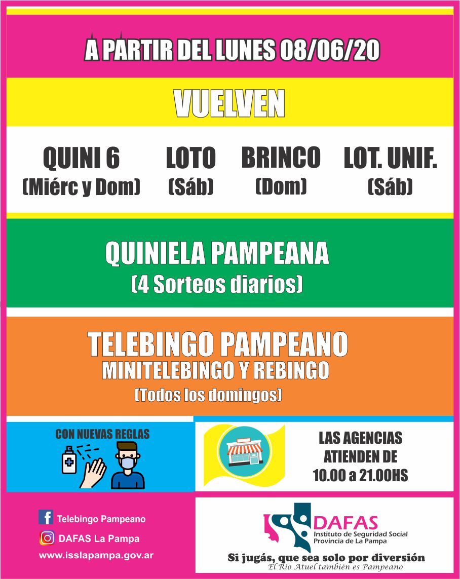 DAFAS recuerda que desde fines de mayo se reanudaron también los domingos los sorteos de Telebingo Pampeano, en sus modalidades Minitelebingo, Telebingo y Rebingo. Respecto a este juego, se solicita especialmente no enviar los cartones no ganadores ya que este sorteo fue reemplazado por sorteos electrónicos.